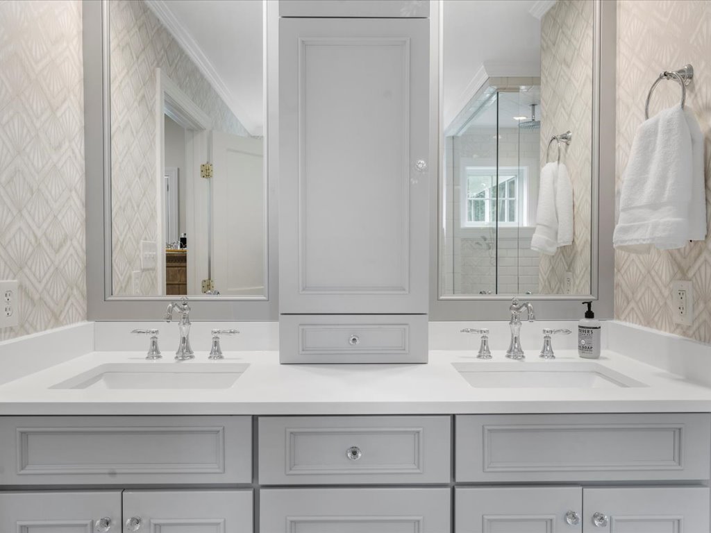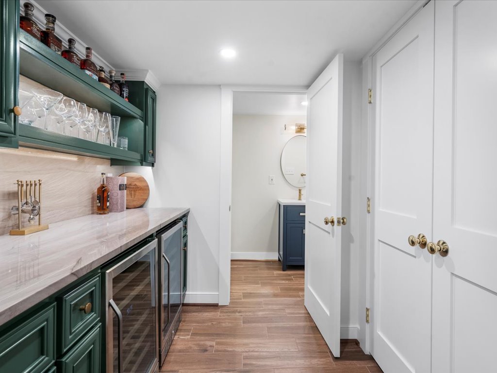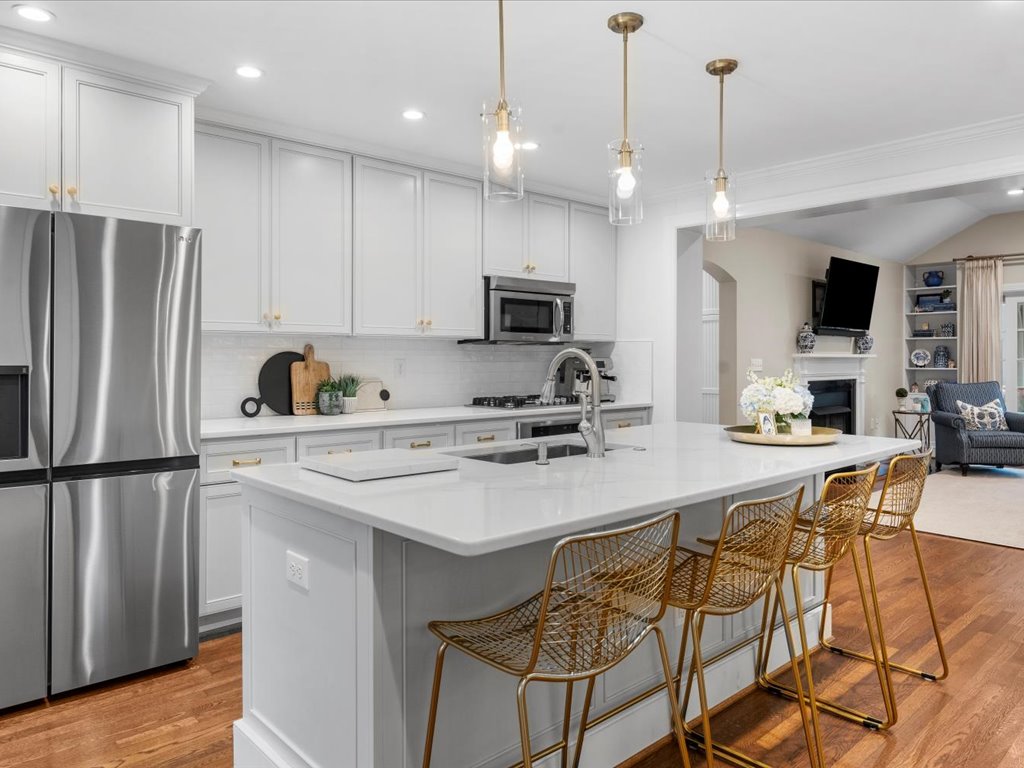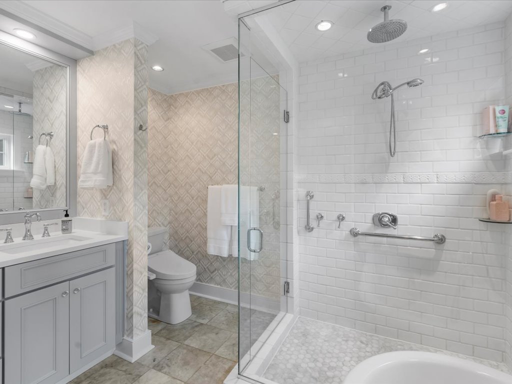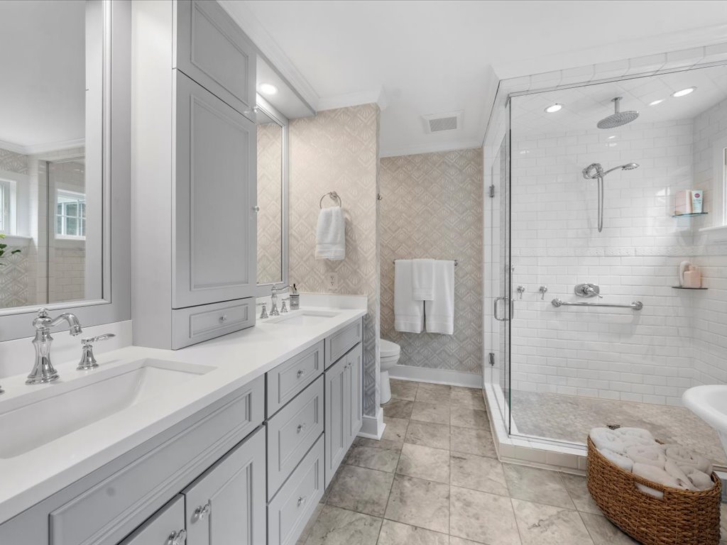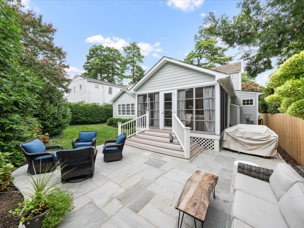 Looking for a turnkey renovated home offering a first floor primary suite with great walkability to the shops and restaurants in the Libbie Grove corridor? Well, this 3 bedroom, 4 full bath Colonial house in the desirable Glenburnie neighborhood checks all of the boxes! This beautiful home which has been thoughtfully renovated to create exceptional open-concept flow for ideal living. From the gracious foyer, step into the dining room with fireplace that opens to both the family room and eat-in kitchen. The stunning kitchen offers ample cabinetry, stainless steel appliances, subway tile backsplash and quartz counters and an island for pull-up dining. The kitchen seamlessly flows to the spacious family room with vaulted ceiling, built-in bookcases and gas fireplace which then opens to the three-season porch. Heated and cooled by a mini-split with vinyl slider windows – you will comfortably enjoy watching the seasons change from this light-filled space overlooking the private backyard. The first floor is completed be a truly luxurious owner’s suite which includes a spacious bedroom with two walk-in closets, a spa-like marble bath with large shower and soaking tub, a laundry room and an office with glass-front cabinetry and ensuite renovated full bath. The second floor features two generous bedrooms, one with separate dressing room/office, and a full bath. The lower level has just undergone an extensive renovation with large recreation room, stunning bar with two wine refrigerators, glass-front cabinetry and quartz counters plus a renovated full bath, cedar closet and built-in storage cabinets. As the weather cools, you will love spending the mornings on your front porch or the evenings on the bluestone patio surrounded by a meticulously landscaped and irrigated yard. With newer HVAC systems, a neutral color palette, recently maintained roof, whole house generator and new security system, all you need to do is move right in!