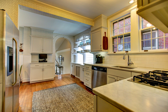 - All white kitchen with stainless appliances and marble counters