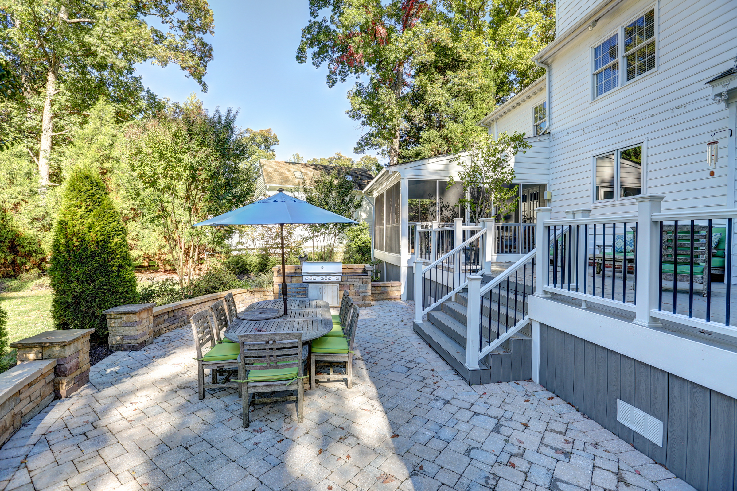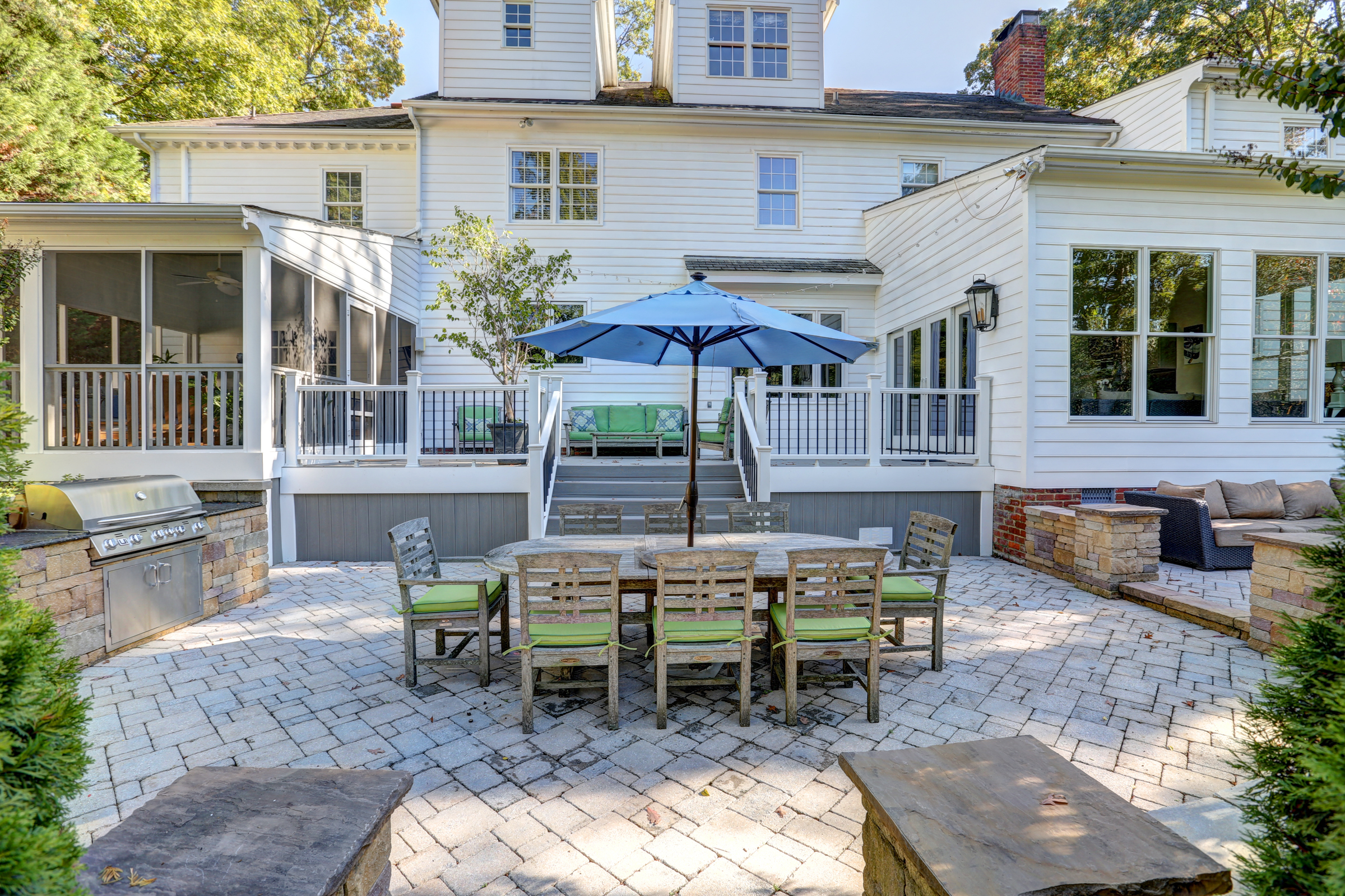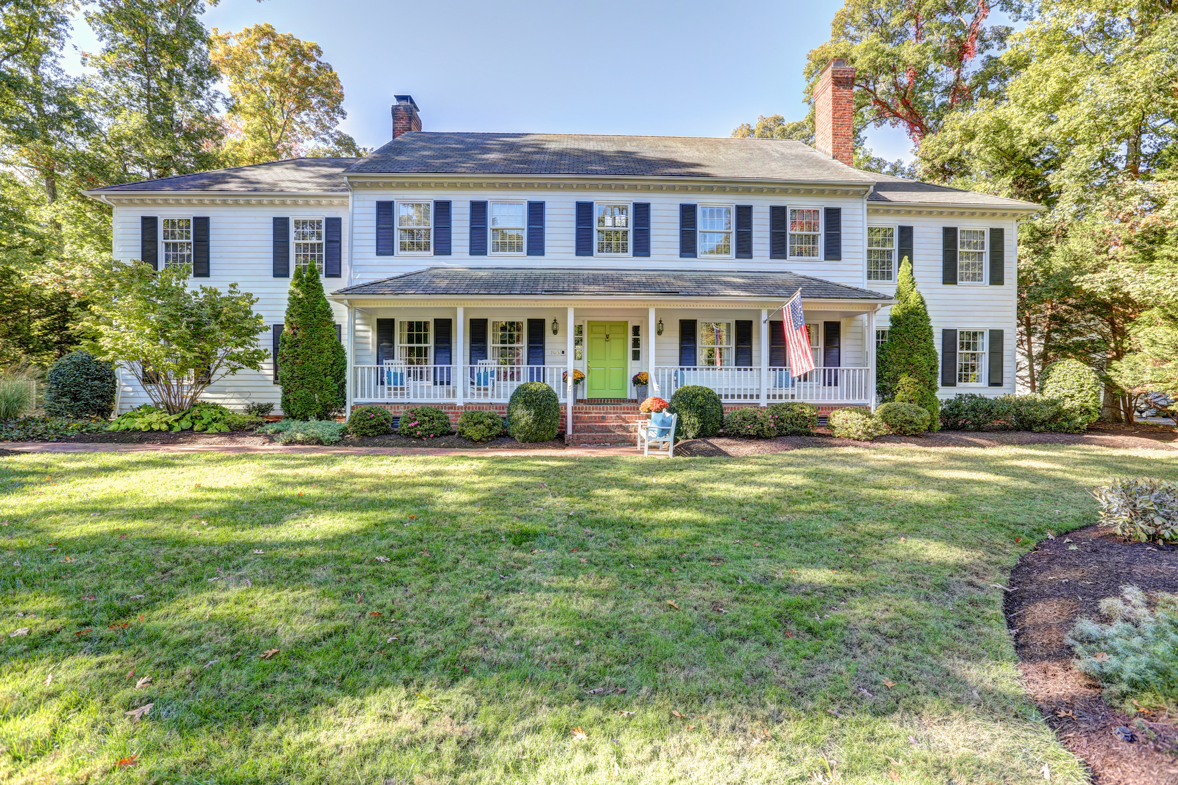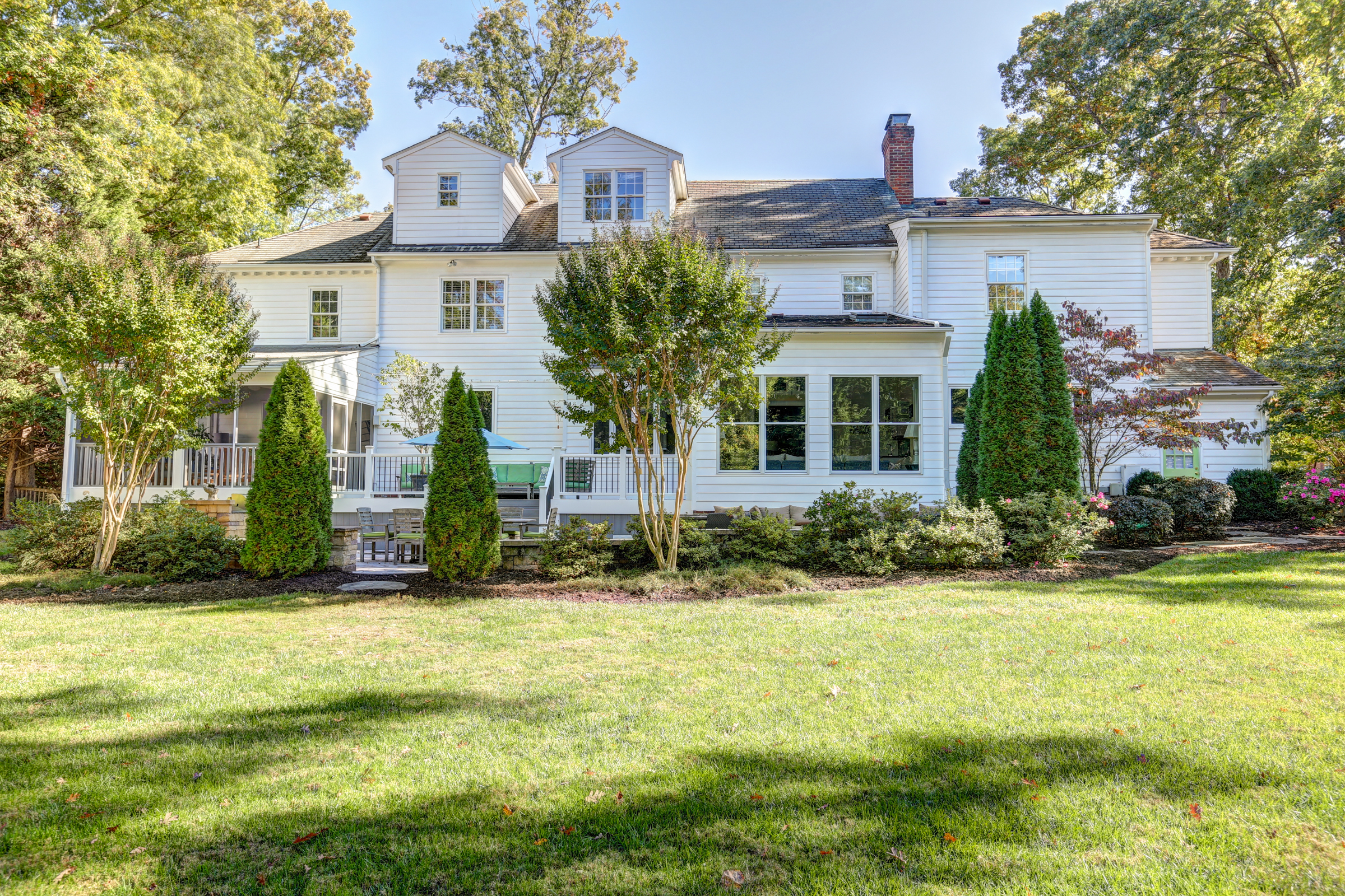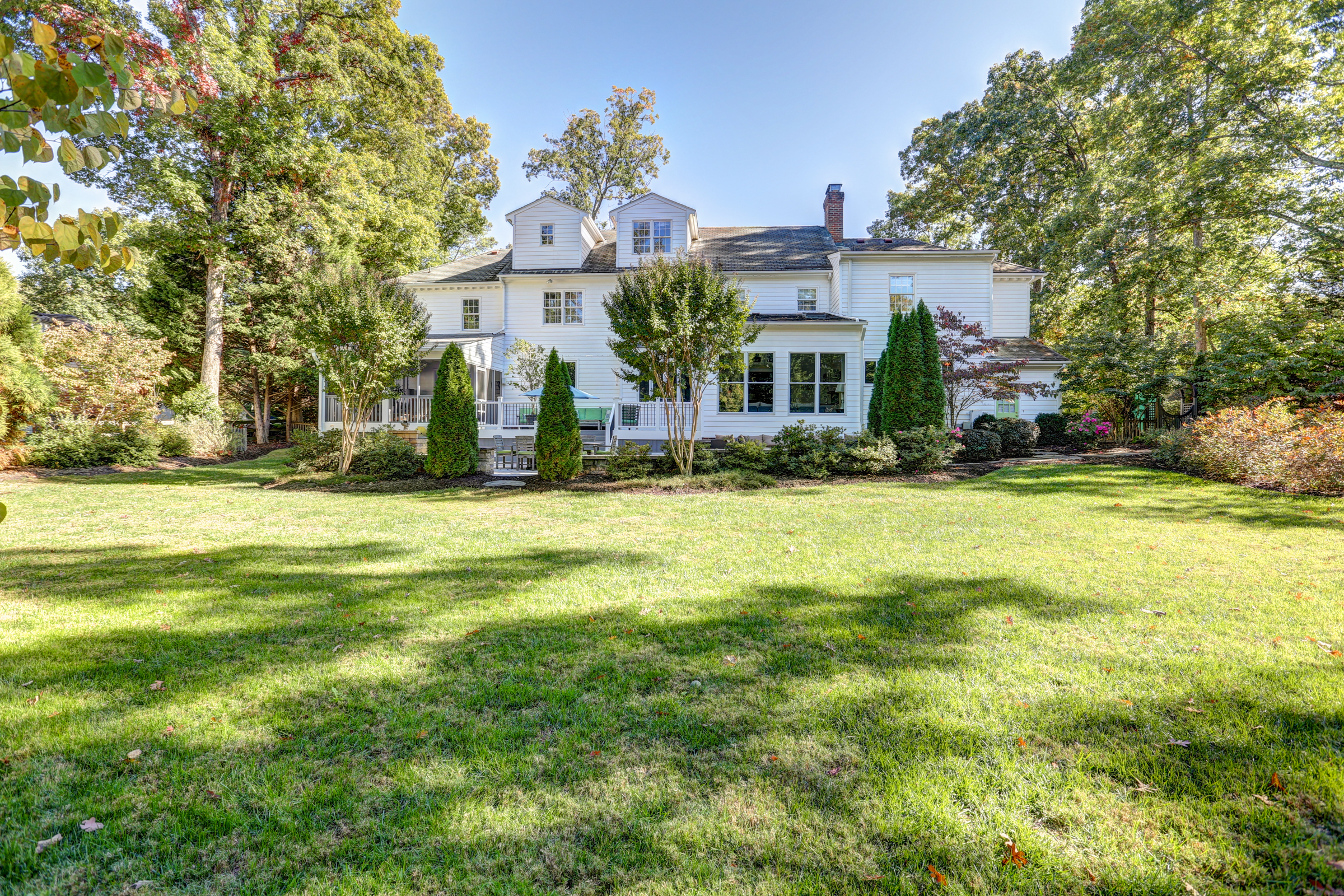 This 5 bedroom, 5 1/2 bath 2-story Colonial with full front country porch exudes charm and gracious living both inside and out! The first floor features a grand foyer, formal living room with fireplace, banquet-sized dining room and a NEW kitchen with custom white cabinetry, granite counters and GE Monogram stainless appliances that opens to a sunken family room with woodburning fireplace and a sunroom that overlooks the park-like landscaped yard. Upstairs you will find 5 bedrooms -each with their own private bath – a RARE FIND! THE spacious master suite features an adjoining office, HUGE walk -in closet, cedar closet and renovated master bath with separate granite vanities and 6 x 6 marble shower. This house is completed by multiple outdoor spaces – a new screened porch, the maintenance-free composite deck and a custom tiered stone terrace with built-in grill. Bonuses include the 2-car attached garage, irrigation and security systems. Walking distance to The Collegiate School and convenient access to interstates.
