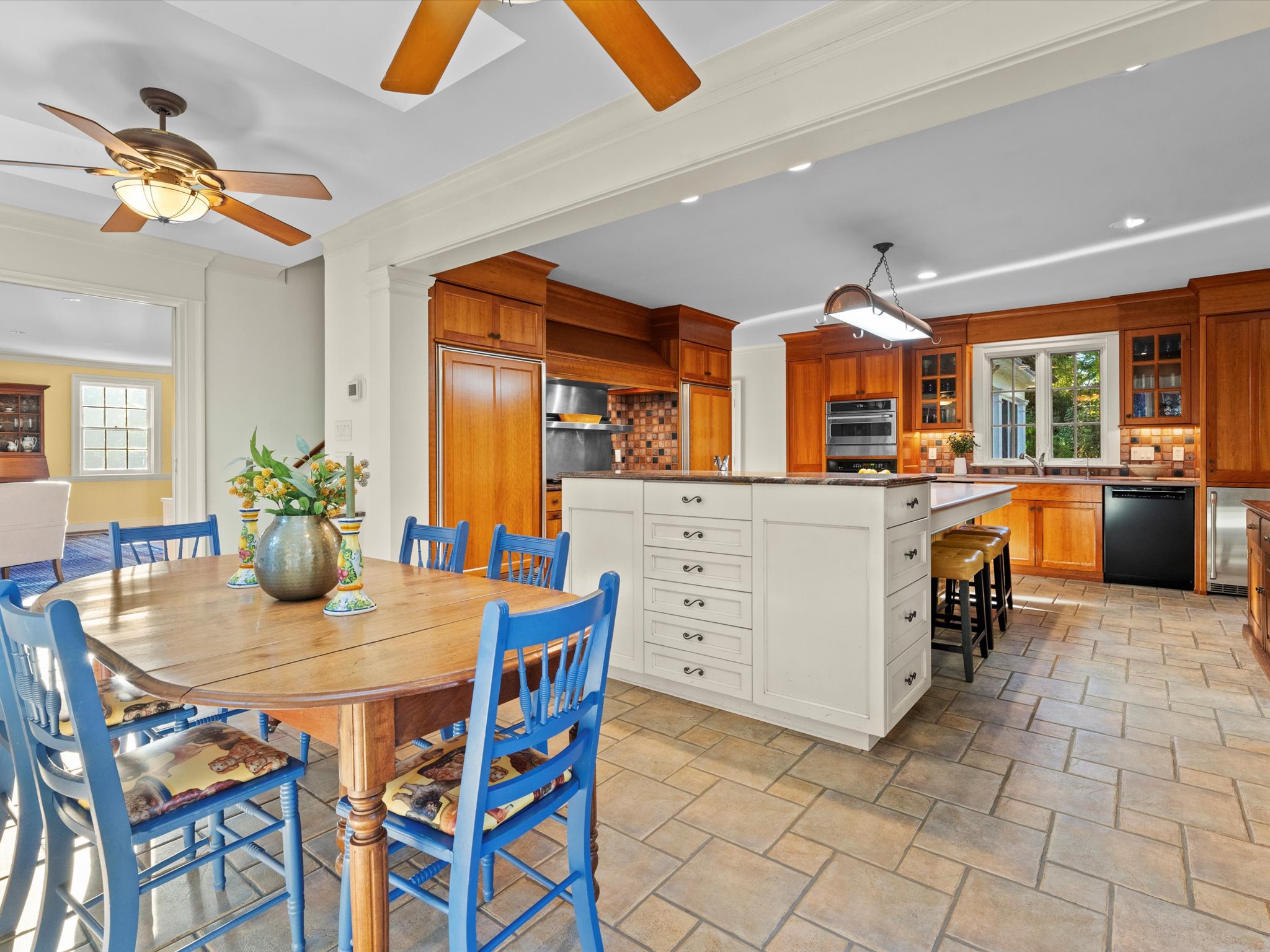 With exceptional flow throughout, the gracious formal rooms showcase exquisite craftsmanship with wide cased openings and intricate crown moulding. The three fireplaces, custom built-in bookshelves and casual living spaces add to a warm and welcoming atmosphere. The spacious kitchen features abundant cherry cabinetry and storage, a generous center island and a light-filled breakfast room surrounded by an expanse of windows overlooking the bluestone patio and enchanted gardens. A mudroom with cubbies provide the much-needed drop zone area – and a laundry room with overflow pantry storage are conveniently located off of the kitchen. The first-floor office provides a quiet retreat, while the expansive lower level offers two large recreation rooms—ideal for play, media, a gym or a second home office.