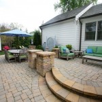 - Tiered stone terrace with built-in gas griller and cold storage chest.