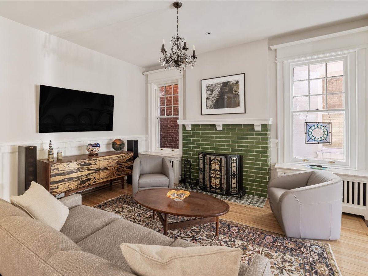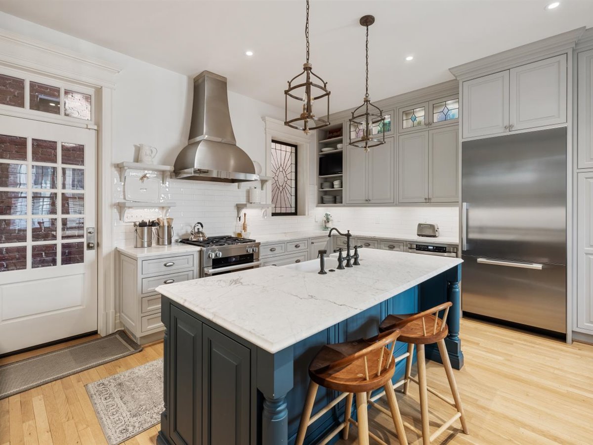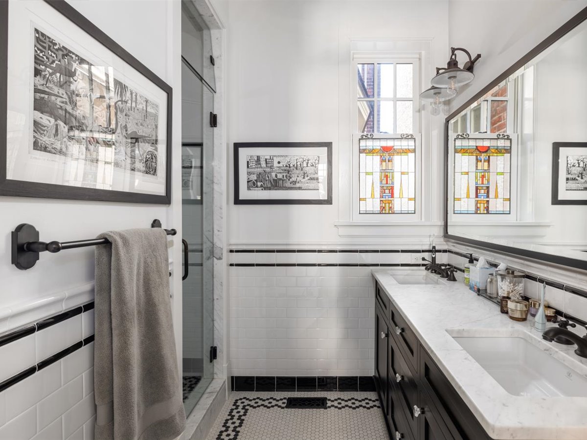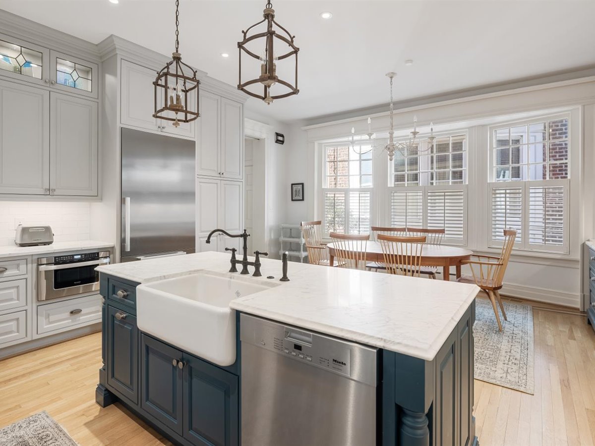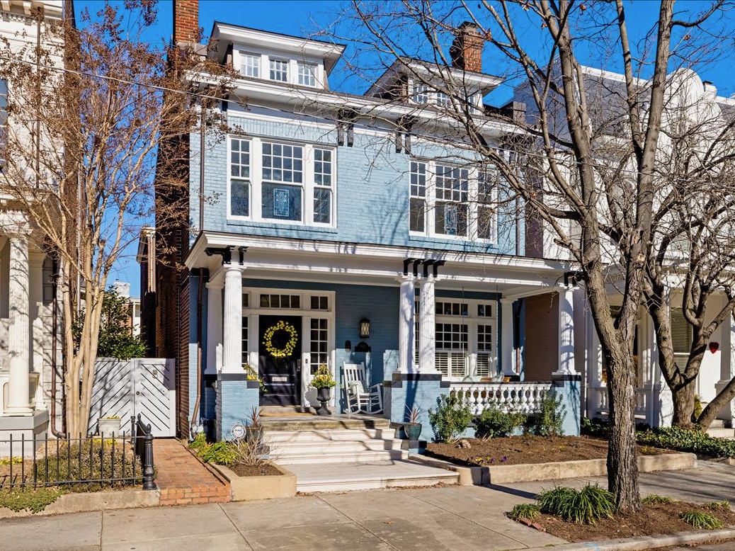 Meticulously renovated 5 bedroom, 4 1/2 bath home with FIRST FLOOR PRIMARY SUITE AND 3 CAR GARAGE. Extensively renovated in 2017, this detached Fan rowhouse offers a large foyer with beautiful wainscoting and turned staircase, double parlors with fireplaces, a high-end Chef’s kitchen with custom cabinetry, Miele stainless steel appliances and Carrara marble counter/island – all open to an informal dining area with expansive bowed window. The first floor is completed by a primary bedroom suite with dual walk-in closets and a beautiful ensuite bath with marble topped vanity and shower. The second floor features a a large family room with built-in bookcases/cabinets plus 3 bedrooms and 2 full baths, including a private suite with separate sitting room and balcony. The third floor features a charming bedroom with built-in beds and desks plus full bath- a perfect space for a private teen suite, sleepovers or even a virtual school set-up! Bonuses include full front porch, enclosed bluestone courtyard, 9+ ft. ceilings, 4 fireplaces, wood floors throughout, and interior basement for home gym/workshop plus a sizable tax abatement until 2027!