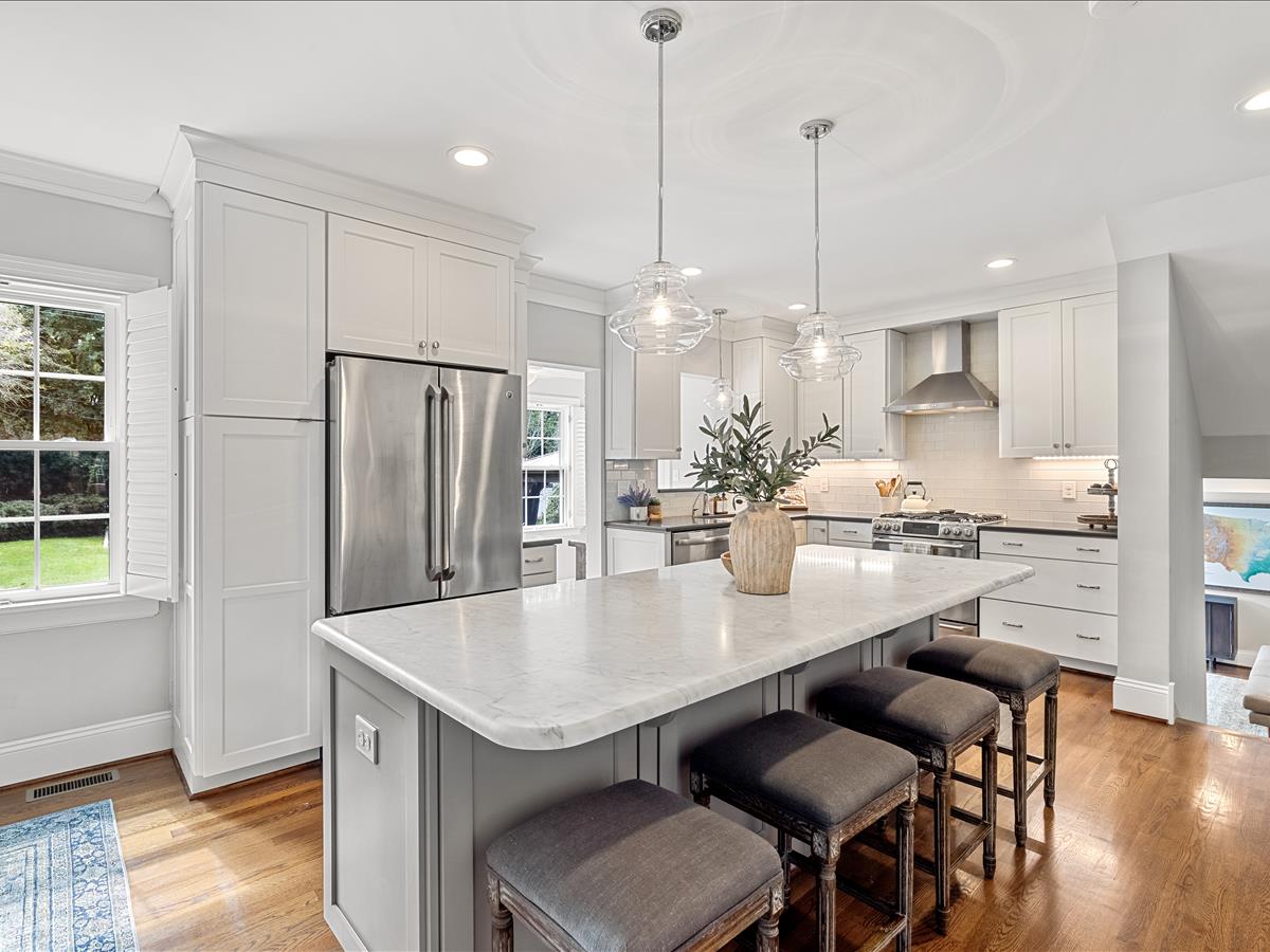 Sited on a large flat lot in the desirable Windsor Farms neighborhood, sits this fully renovated tri-level home loaded with light and charm. An attractive and peaceful living room is open yet cozy with a gas fireplace and two built-in bookcases that flows into a wonderful dining area and eat-it kitchen equipped with stainless steel appliances, caesarstone quartz and honed marble countertops, an expansive center island with bar seating- perfect for entertaining. Step down from the kitchen into the comfortable family room with french doors to the backyard, a private office and huge laundry room with many built-ins plus a full bath! Upstairs offers a fantastic master suite with multiple closets and a luxurious ensuite master bath outfitted with a carrara marble glass shower and double sink vanity. There are two additional bedrooms and a full bath. Outside you will find a lovely stamped concrete covered patio to entertain your friends on warm summer nights and a 2 car attached garage. Abundant storage is also a feature in this wonderful home! Do not miss this jewel in Windsor farms.