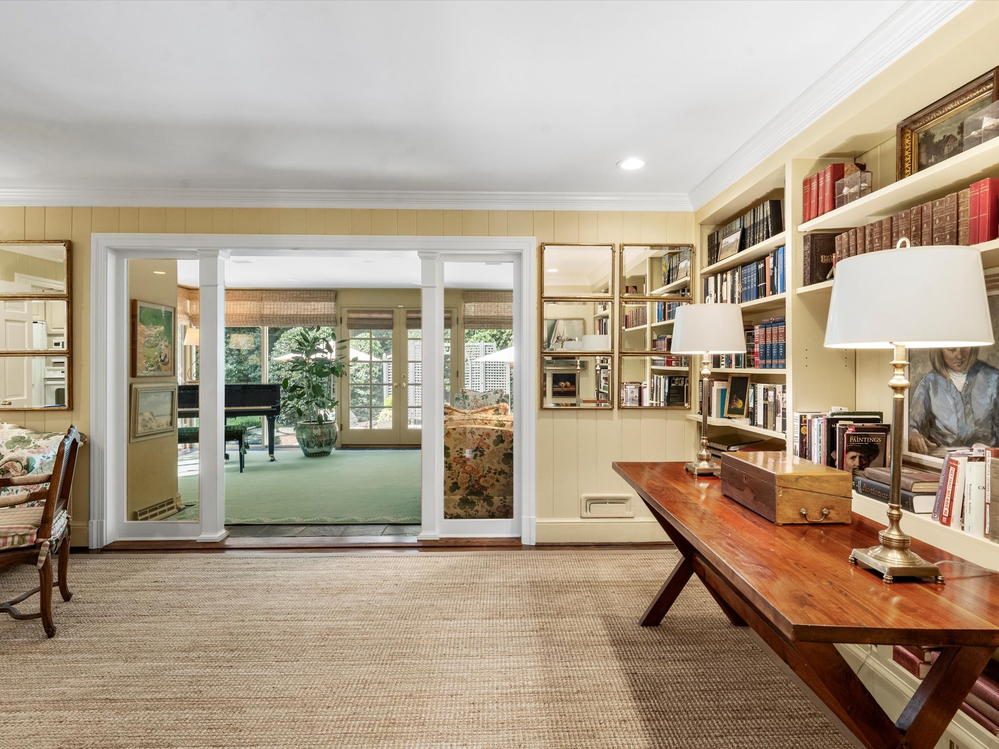 Located in the sought-after Saint Christopher neighborhood, sits this charming one-level brick and slate home that has been lovingly cared for and beautifully updated. Blending timeless charm with modern ease the sunlight streams through a graceful bay window, filling the home with warmth and highlighting elegant hardwood floors and crown moldings throughout. Large formal rooms create a gracious tone, while a cozy den with fireplace and built-in bookcases flows seamlessly into a window-wrapped sunroom where serene views of the lush yard and stone patio await. An updated and eat-in kitchen blends style and function, and a versatile family recreation room with built-in desk area and private side entry adds convenience. The spacious primary suite offers abundant closet space and a private retreat, complemented by two additional bedrooms and updated baths. Offering the ease of one-level living, refined architectural details and an unbeatable location, this home is a rare jewel in the Westend area.